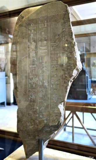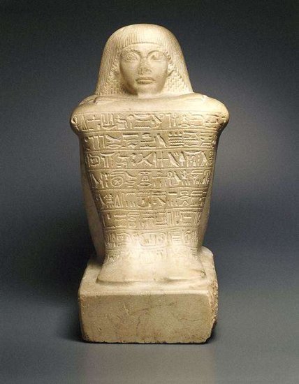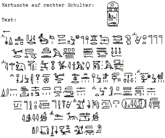 Die Inschriften der Statue gehören allerdings in die 3. Zwischenzeit, sind also etwa 300 Jahre später auf die Basis und die Rückenplatte gemeißelt worden. Dass sie an die Stelle einer älteren, originalen Beschriftung gesetzt wurden, zeigen deutlich Spuren der Abarbeitung der ursprünglichen Steinoberfläche.
