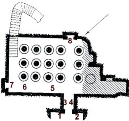 Über einen kurzen Korridor (PM 12 im Plan oben), an dessen Wände der Grabeigentümer seine verstorbenen Eltern trifft, gelangt man zu einem Raum mit vier Säulen (A+B+C+D), die alle mit Bildern des Verstorbenen und seiner Frau geschmückt sind, die den Göttern Opfer darbringen. Auf dem Pfeiler "C" ist der Verstorbene im Offertorium (Totenkultkapelle) von König Amenophis I. und Königin Ahmose-Nefertari dargestellt.