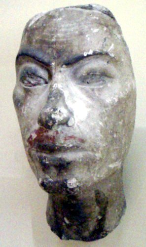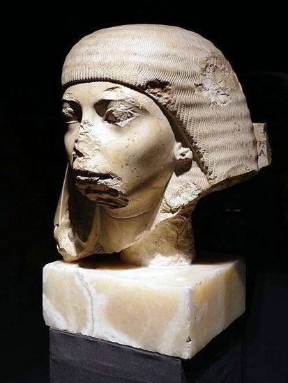 Porträtkopf aus Gabbro ( dunkelgraues Tiefengestein) einer Sitzfigur unbekannter Herkunft, vielleicht stellt sie Eje als Beamten dar. Heute befindet sich dieser Kopf in der Münchener Ägyptologischen Sammlung, ÄS 6296.