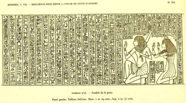 Eje und seine Gemahlin Teje in ihrem gemeinsamen Grab (Nr. 25) in Achetaton – dieses Bild befindet sich an der rechten Eingangswand. Eje und seine Frau, die königliche Amme Tyi knien mit erhobenen Armen im Anbetungs- und Verehrungsgestus vor Aton.