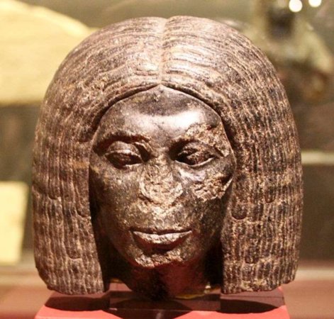 Der formale Aufbau des Kopfes wirkt streng, während der Scheitel eine Mittelachse vorgibt, deren Senkrechte in der Strähnung der Seitenteile der Perücke aufgenommen wird. Augen, Mund und das kantige Kinn markieren deutlich waagerechte Linien. Hier ist scheinbar eine ausgeprägte Persönlichkeit porträtiert worden, deren Identität jedoch unbekannt bleibt, da die Statue während der dritten Zwischenzeit von einem Priester usurpiert wurde, der im Dienst eines Sopdutempels im Ostdelta stand.