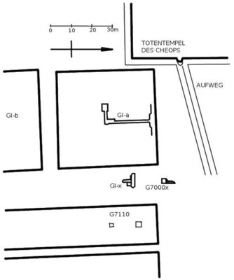 Als Erklärung für die fehlenden Oberbauten des neuen Grabes G 7000x schlug Lehner stattdessen vor, dass es sich bei dem Schachtgrab von G 7000x in Verbindung mit dem T-förmigen Aushub GIx als Teil einer nicht vollendeten Pyramidenanlage handelt (Quelle: Lehner, Hetepheres, 1-44 in Silke Roth: Königsmütter, S. 75).