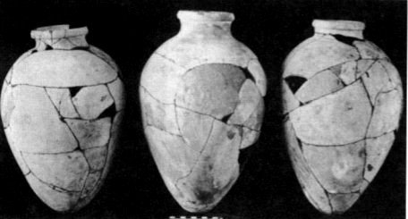 Tongeschirr aus dem Grab der Hetepheres Gruppe A, Typ IIb (nach Reisner) hohe Weinkrüge mit "eingezogener Schulter" und kurzen Hals und nach außen gerollten Rand. |