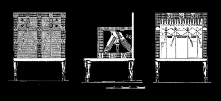 Die Dekoration der Armlehnen bestand aus einem Horusfalken mit ausgebreiteten Flügeln, der auf einer Palme stand.