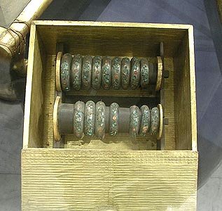 Elfenbein-Knauf, um das Kästchen zu öffnen. Im Inneren des Schmuckkästchens befanden sich zwei herausnehmbare Walzen, auf denen ursprünglich je 10 silberne Armbänder mit sich verminderndem Durchmesser aufgereiht waren. Jeden dieser Armbänder zieren vier Schmetterlinge mit Einlagen aus Türkis, Lapislazuli und Karneol. Innen und Außen ist das Holz des Kästchens mit gerippten Gold-Blättern verkleidet und an den Rändern befinden sich Matten-Muster. (Bild: mit frdl. Dank Jon Bodsworth - gemeinfrei) |