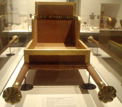 | Der einfache, kastenförmige Tragestuhl war ein Geschenk des Cheops an seine Mutter, der aus zwei Tragestangen besteht, die in goldenen Palmblattkapitellen enden und den Rahmen des Sitzkasten tragen, dessen Leisten aus dunklem Ebenholz gearbeitet waren. Die Seiten und die Rückenplatte bestanden aus hellem Holz, das in den Jahrtausenden verrottet war und daher restauriert werden musste. Lederriemen und mit Kupfer überzogene Zapfen hielten den Tragestuhl zusammen. |