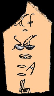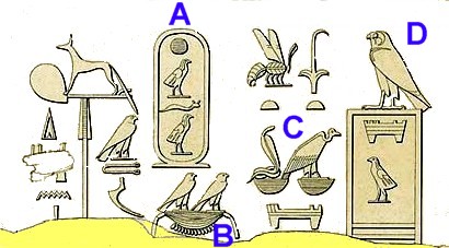 Dreispaltige Inschrift aus Felsrelief Wadi Maghara In der hier als Umzeichnung dargestellten Inschrift des benachbarten Felsreliefs aus dem Wadi Maghara auf dem Sinai befindet sich rechts der Horusname (D) des Chufu/Cheops. Auf dem "Serech" befindet sich der Horusfalke, im oberen Feld der Palastfassade wird der Horusname "mDdw" (Beckerath Handbuch) wiedergegeben. Links daneben steht der unvollständige Nebti-Name (C) "MDd-r-nbtj" [Medjed er Nebti = Der (die Feinde) zerdrückt, entsprechend den beiden Herrinnen" / nach Schneider]. In der Bildmitte (A) befindet sich der in eine Königskartusche geschriebene Geburtsname des Königs (hier in der Kurzform "Chuiefui" / allgemein als "Chufu" [er beschützt mich / nach Lexikon der Pharaonen] gelesen. |