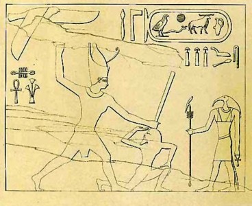 Cheops beim "Erschlagen der Feinde". Über der Darstellung auf dem Felsrelief steht der Geburtsname des Königs: