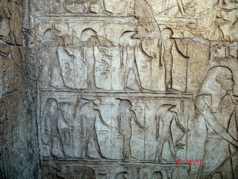 Im unteren Register der Südwand assistieren verschiedene Gottheiten Horus (in menschlicher Gestalt) beim "Ritual der Erweckung" seines Vaters Osiris (siehe nächstes Bild), der auf einer Bahre liegt.