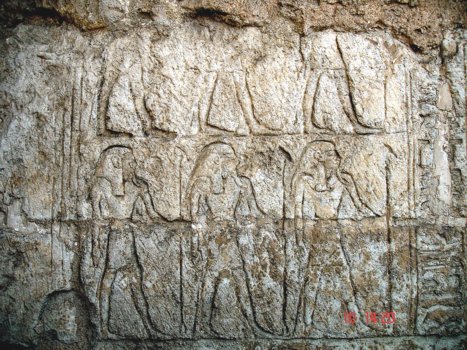 An der nordwestlichen Gesimswand befinden sich Darstellungen, die den König kniend mit einem Trankopfer und einem Tablett mit Nahrung vor den Göttern zeigt.