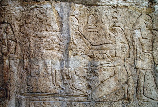 Die Göttin Nephtys kniet vor König Schoschenq III. und widmet ihm ein Trankopfer und ein Opfertablett mit Nahrung. (Informationsquelle: J. Lazaro)