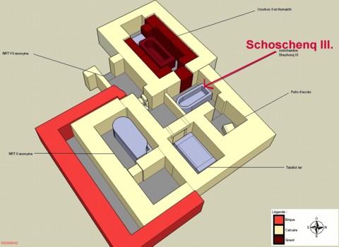 König Schoschenq ließ sich in Tanis in der dortigen Nekropole innerhalb des Tempelbezirks gelegen, einen kleinen Grabbau, der aus einem Vorraum und einer Sarkophag-Kammer bestand, errichten.