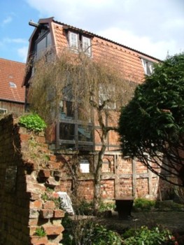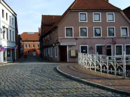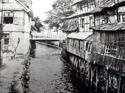 in die Ritterstraße Durch die Ritterstraße kommt man zurück zur Mühle am Fleth. Legenden berichten über die Ritterstraße, dass dort die Stadtreiter in kleinen Häuschen mit einer Stube für den Reiter und sein Pferd wohnten. Vor dem Ausritt in die Stadtumgebung versammelten sich die Ritter vor dem Platz vor dem Geesttor (Bild: J. H. Pirzer) |