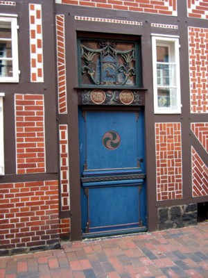 Buxtehuder Heimatmuseums in der Straße "Stavenort" - Auf der Türfüllung ist das Datum 1849 und der Name J. H. Siechmann (?) zu lesen - dazwischen eine Pferdedarstellung. Darunter in zwei Rundfassungen die Namen Michael Blohm und Adelheid Blohmen und ein Datum (1811 ?) - (Für Informationen hierzu wären wir dankbar.) (Fotos: J. H. Pirzer) |