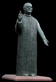 mit erhobener Hand von einem Brunnendenkmal herab. Der Magister war
