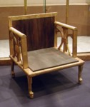 | Dieser Armsessel, der mit Ausnahme der Sitzfläche und der Rückenlehne komplett mit Gold überzogen war, stand ursprünglich mit dem Rücken zum Alabastersarkophag. Er wurde zusammen mit einem ähnlichen Armsessel neben dem Kalzit-Sarkophag der Königin gefunden. |